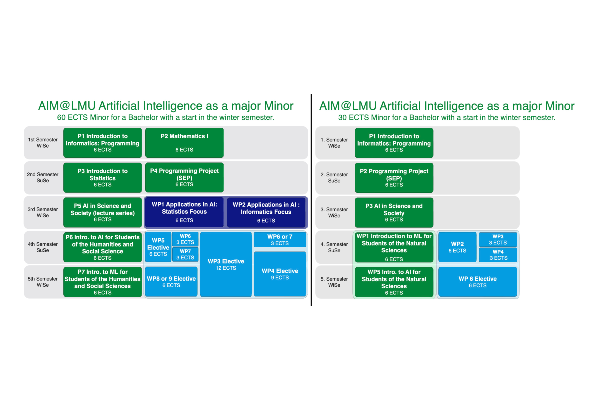 The minor subject model for the 60 ECTS minor will offer two blocks of 30 ECTS each in the bachelor’s degree, a “Basics” block and an “Artificial Intelligence” block (see figure below). For the 30 ECTS minor subjects, basic knowledge of mathematics and computer science/programming will be assumed so that the first block can be omitted.